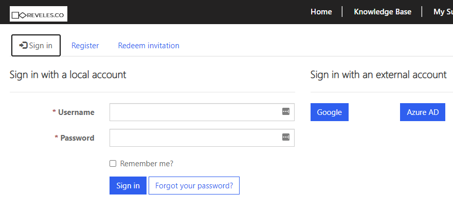 If the customer is unable to find their answer to the queries by perusing the Knowledge Base, they can submit a support case. To do so they will need to sign in. To login customers will need to be extended an invitation by a support representative (see Setting a New User up On Support). Authentication can be preformed by creating a user ID and password, or by using an external authentication system like Google, or Azure AD.